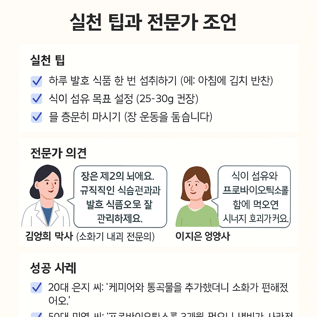 - 김영희 박사(소화기 내과 전문의): “장은 제2의 뇌예요. 규칙적인 식습관과 발효 식품으로 잘 관리하세요.”
