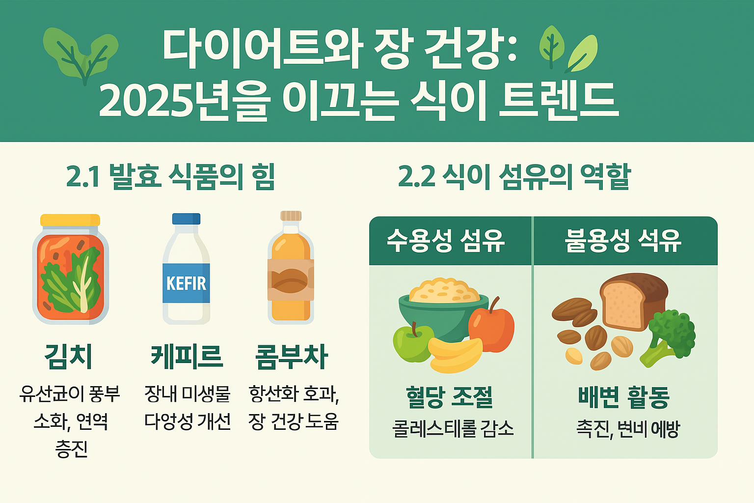 2025년에는 장 건강을 위한 다이어트가 큰 주목을 받고 있어요. 특히 발효 식품과 식이 섬유가 주도하는 트렌드가 인기를 끌고 있죠. 이 두 가지는 장내 유익균을 늘리고 장 환경을 개선하는 데 최고의 선택이에요. 🌿