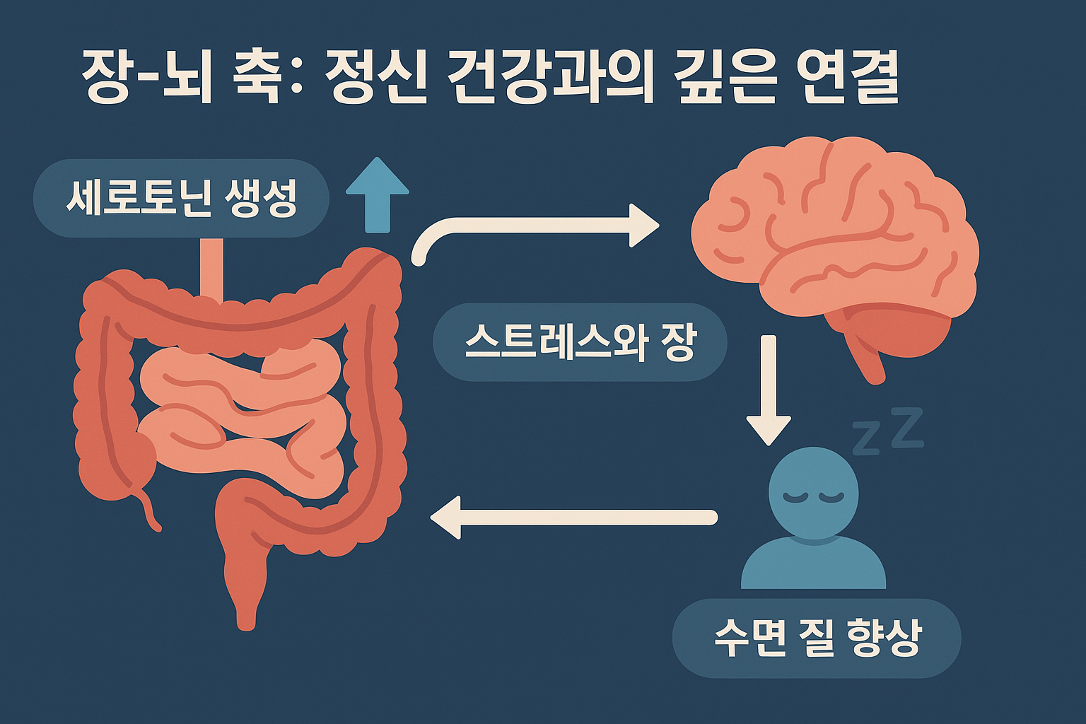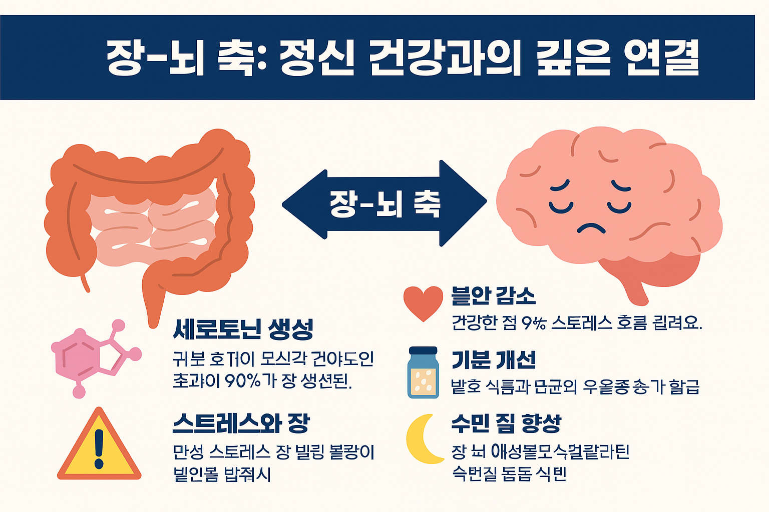 - 스트레스와 장: 만성 스트레스는 장내 미생물 균형을 깨뜨리고, 이는 다시 불안과 우울증을 유발할 수 있어요.