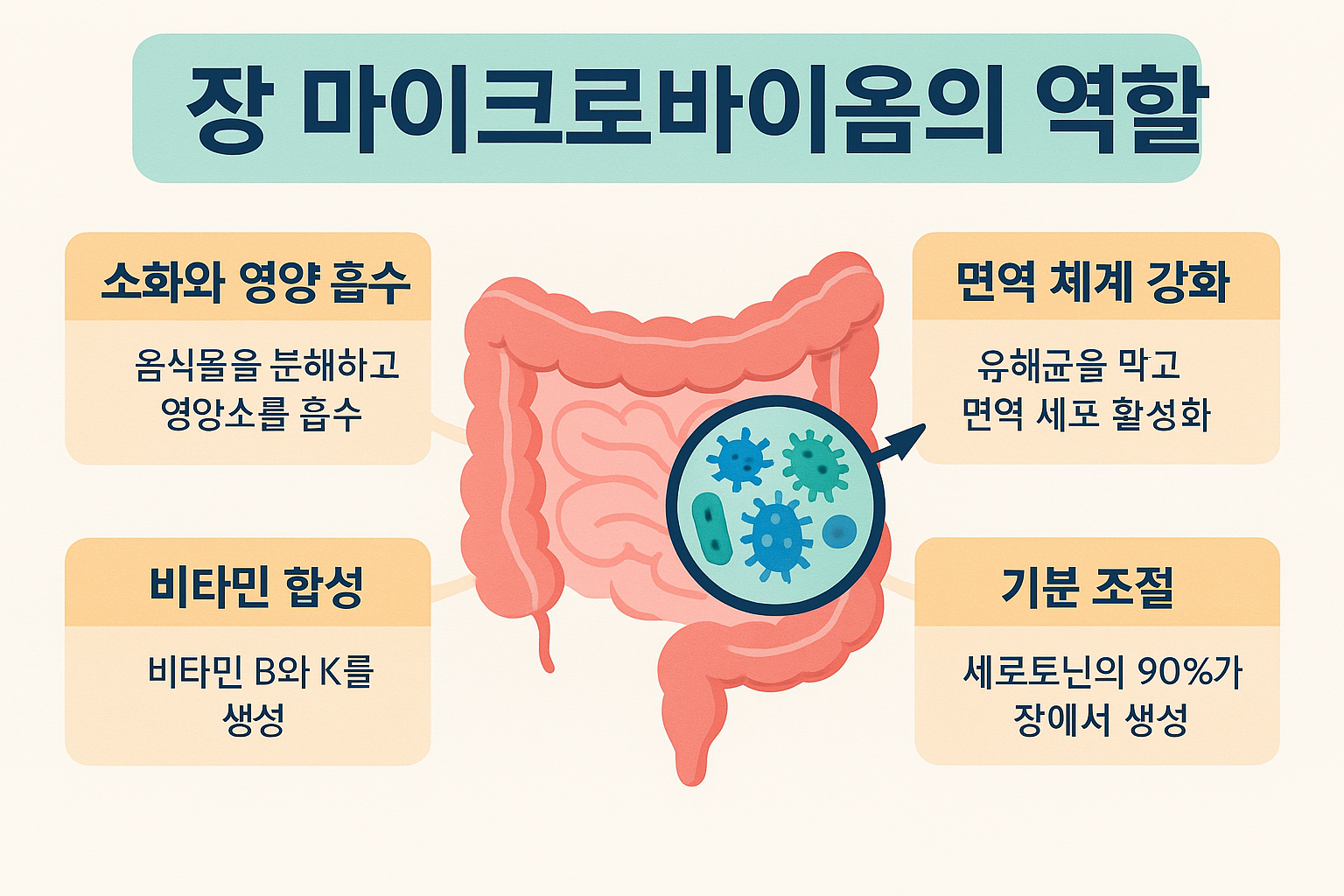 - 기분 조절: 놀랍게도, 행복 호르몬인 세로토닌의 90%가 장에서 생성돼요!